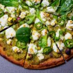 Remove the pan from the oven. Spread the chickpea pesto over the socca and dot with the goat cheese. Return to the oven and broil until the cheese is slightly golden, 4 minutes more. Transfer the socca to a board and top with the sliced serrano, chopped pistachios, mâche and chervil. Drizzle with olive oil and garnish with flaky sea salt, then serve.